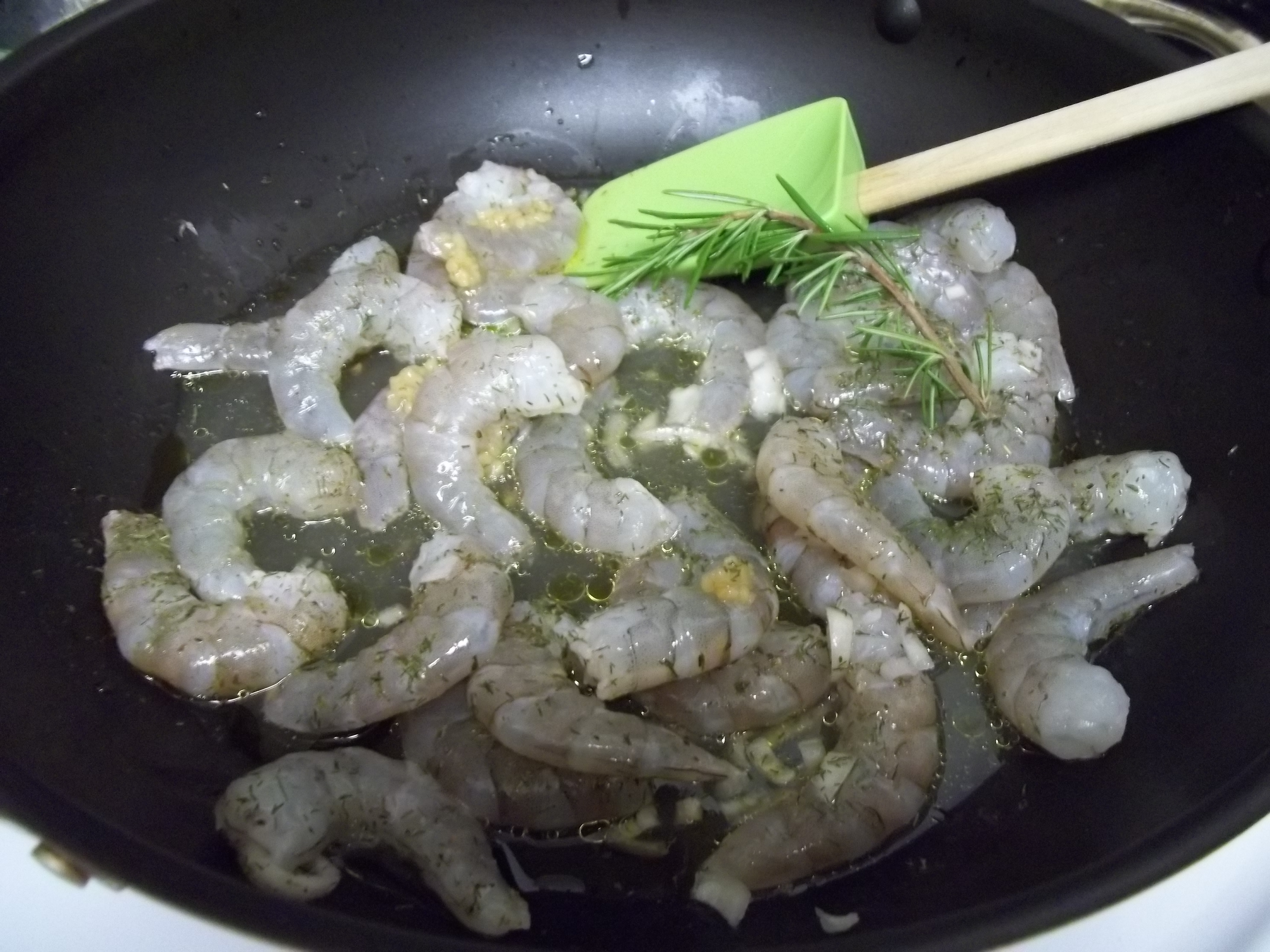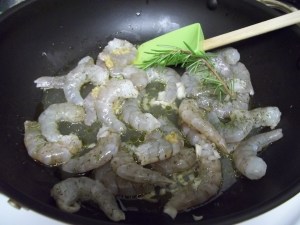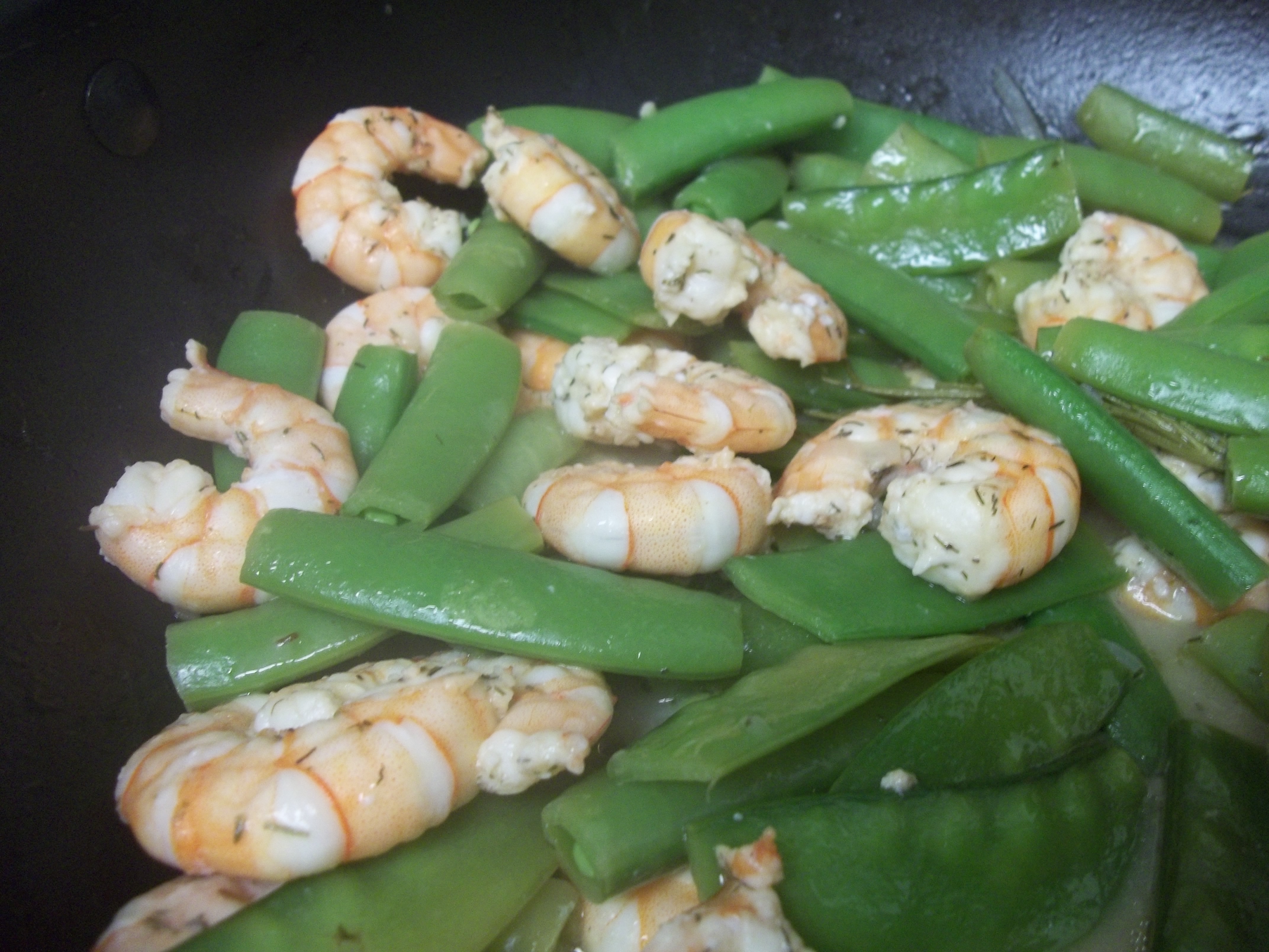 There were two parts to dinner tonight.  First, I sauteed shrimp with snap peas.  In a large skillet, I added a couple tablespoons of oil and one pound of shelled shrimp.  I turned the heat on to medium, and squeezed a few tablespoons of lemon juice, one tablespoon chopped garlic, one tablespoon of chopped shallot, a few shakes of dill, a few shakes of thyme, one fresh sprig of rosemary, one tablespoon honey dijon mustard, and a dash of white wine vinegar.  After the shrimp cooked a little bit, I added the snap peas and covered to cook. (It cooks fast, so keep an eye out.)