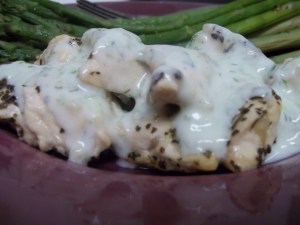 For the sauce, I emptied one container of dairy free plain yogurt into a bowl. Then I added 3 tsp. chopped garlic, a few generous shakes of dill and parsley, one eighth of a cup of white wine vinegar, the juice of one lemon, some sea salt, and grated cucumber. To grate the cucumber, I use a microplane or zester. Cut off the end of the cucumber and push the flat end back and forth across the grater, over the bowl. Grate until you have about 3 tsp of cucumber goodness. Mix all together, pour over the chicken, and serve!