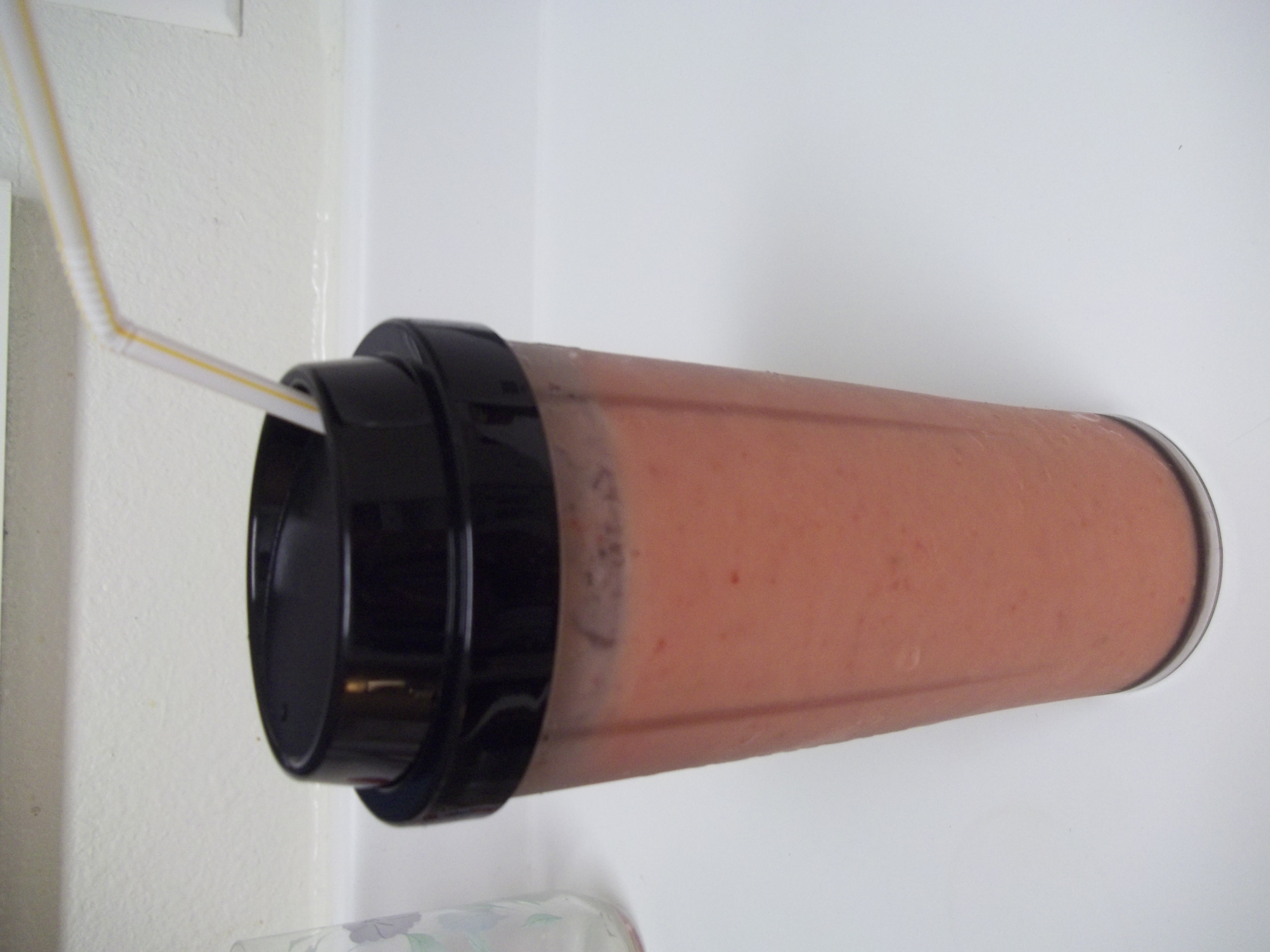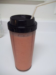 In the winter, I use frozen fruit and fruit juice… fill the blender cup with fruit and pour juice until three quarters full. (Added bonus- no need for ice because the fruit is already frozen.) In the summer, I use fresh fruit, juice, and ice… fill the blender cup with fruit, 3-4 ice cubes, and pour juice until half full. (Added bonus- summer fruits are amazingly tasty and fresh.) I like my smoothies more on the juice side instead of on the suck-so-hard-you’re-cheeks-hurt side.