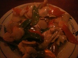 At PF Changs, I tried the Singapore Street Noodles and the Moo Goo Gai Pan.  Both delicious!  Both are regular menu items that they have made gluten free and feature in a gluten free section.  At PF Changs, all gluten free meals come on a different signature plate, so you know that your meal has been cooked in an allergy free environment.  And, I notice NO difference in taste to their regular menu items!  They also offer gluten free soy sauce… a major plus.