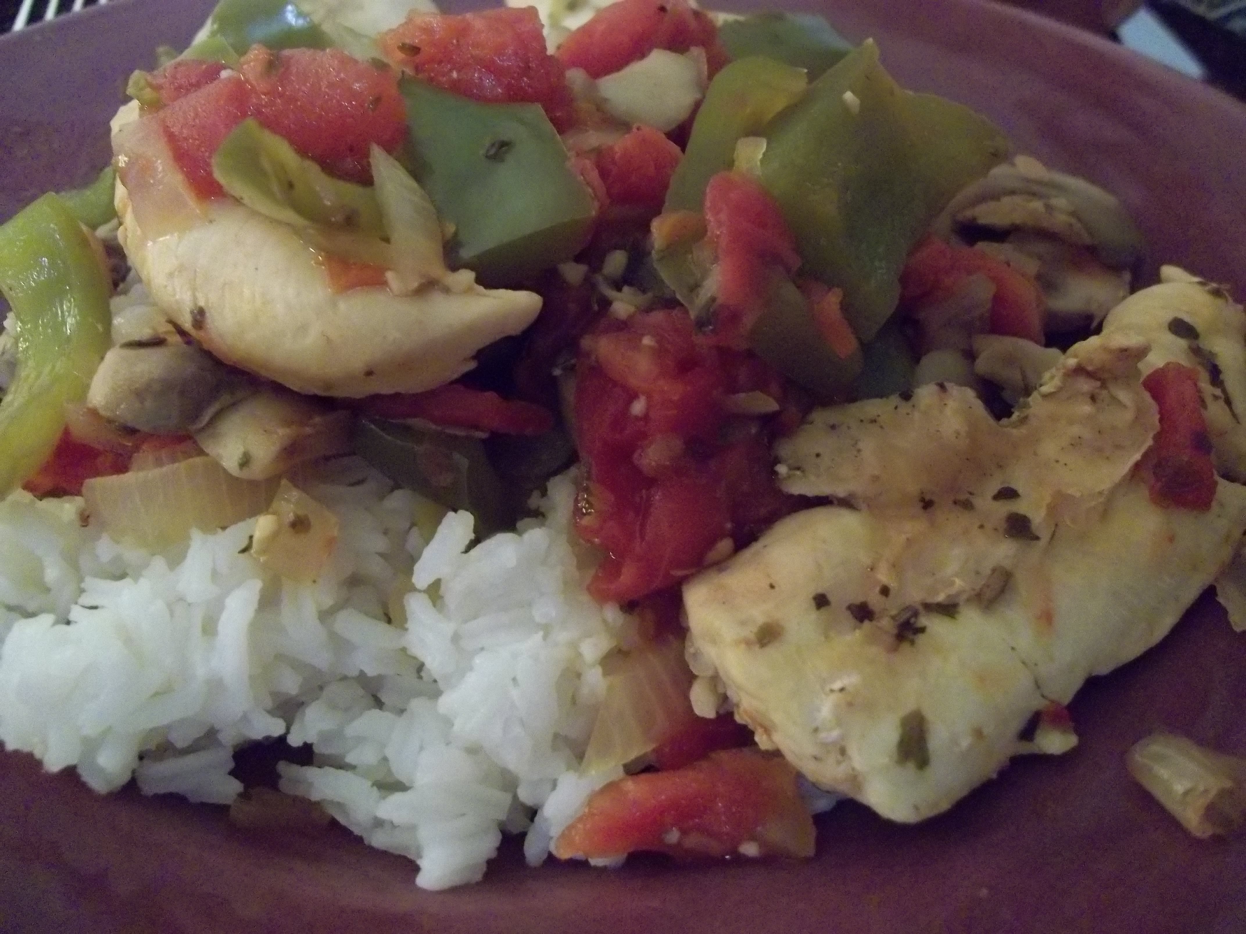 - In the chicken pan, add the peppers and onion. Also add the diced tomatoes, mushrooms, and spices. Cook on medium heat, covered, until cooked through and all ingredients are tender (about 10-15 minutes).