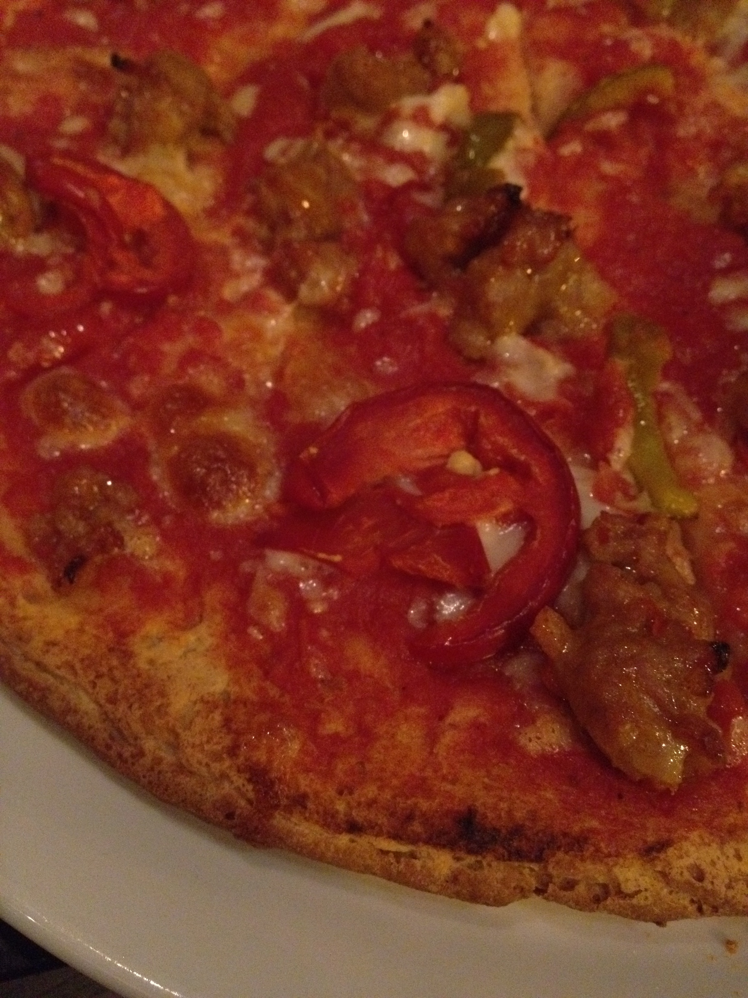 After looking at all my choices, I decided on pizza because I rarely can eat it. I ordered my favorite combo, sausage and hot peppers. I also asked for a BARE sprinkle of cheese… but then realized that pizza should be very cheesy or not at all.
