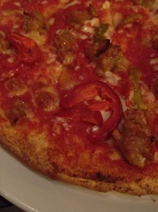 But the excitement really stopped there. The pizza dough was impressive for gluten free, but the toppings were minimal. I wanted a loaded pizza with my favorite combination, and it just didn’t live up to my expectation. There was only about 1-2 sausage and pepper pieces on each pizza slice.