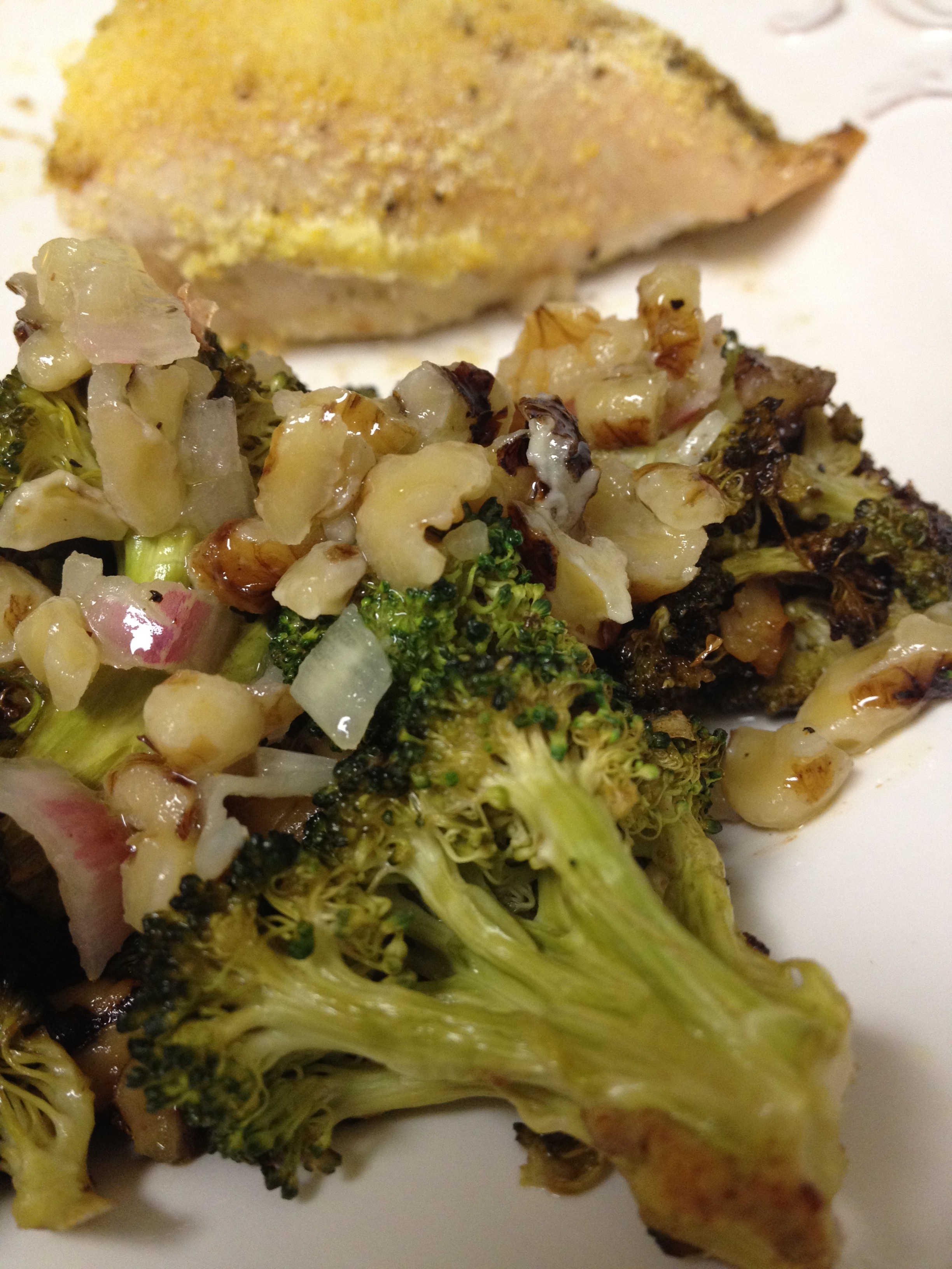 Looking for a side to go with Boyfriend Chicken this week, I noticed some broccoli in the fridge.  I usually love simple roasted broccoli, but wanted to dress it up a little.  So I made a Walnut and Shallot Dressing to add to the broccoli.  Delicious!  And you really could add it to any veggie for a little dressed up flavor.