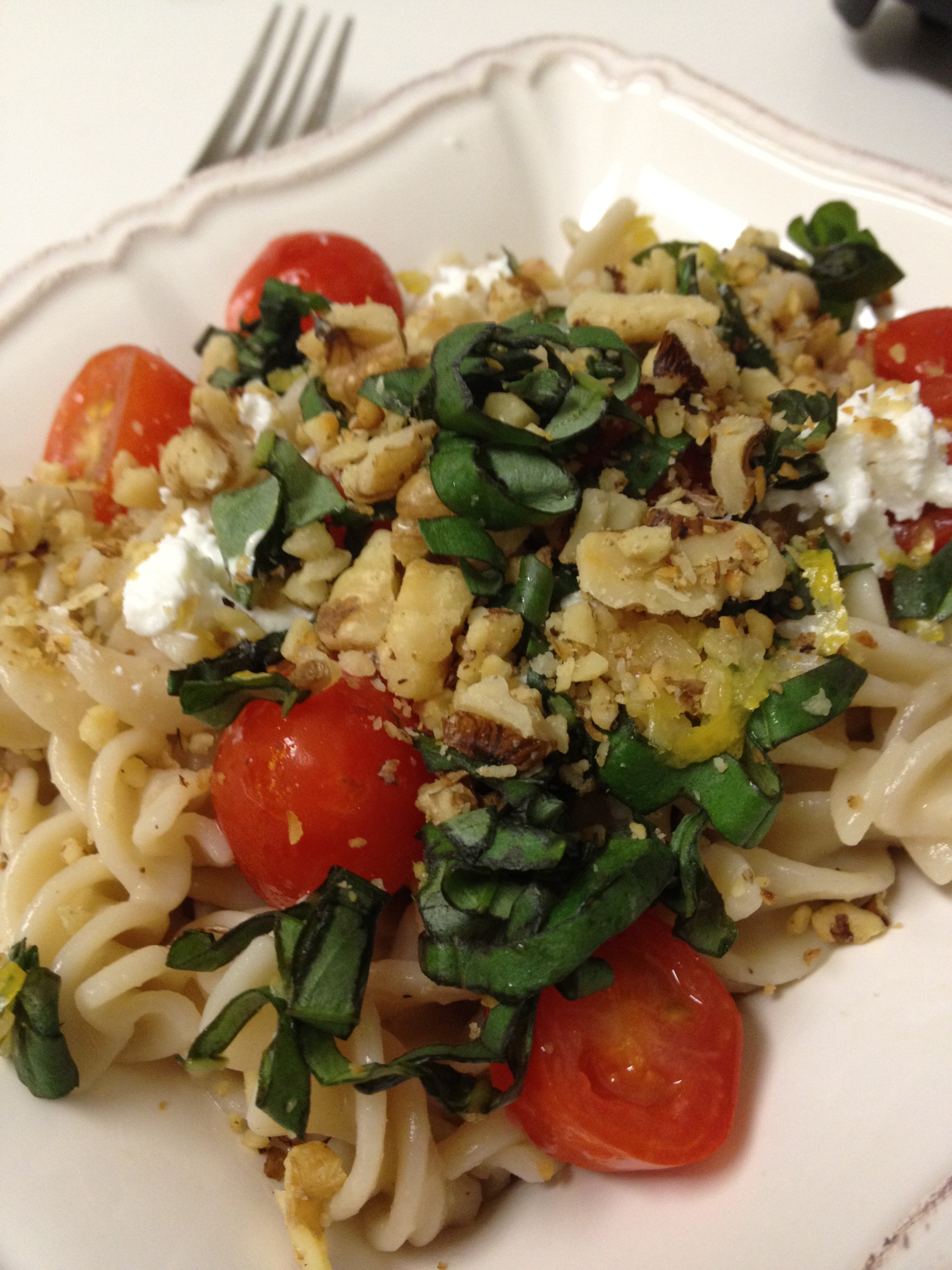 - Sprinkle some of the lemon zest, garlic, basil strips, grape tomatoes, goat cheese, walnuts, and salt and pepper.