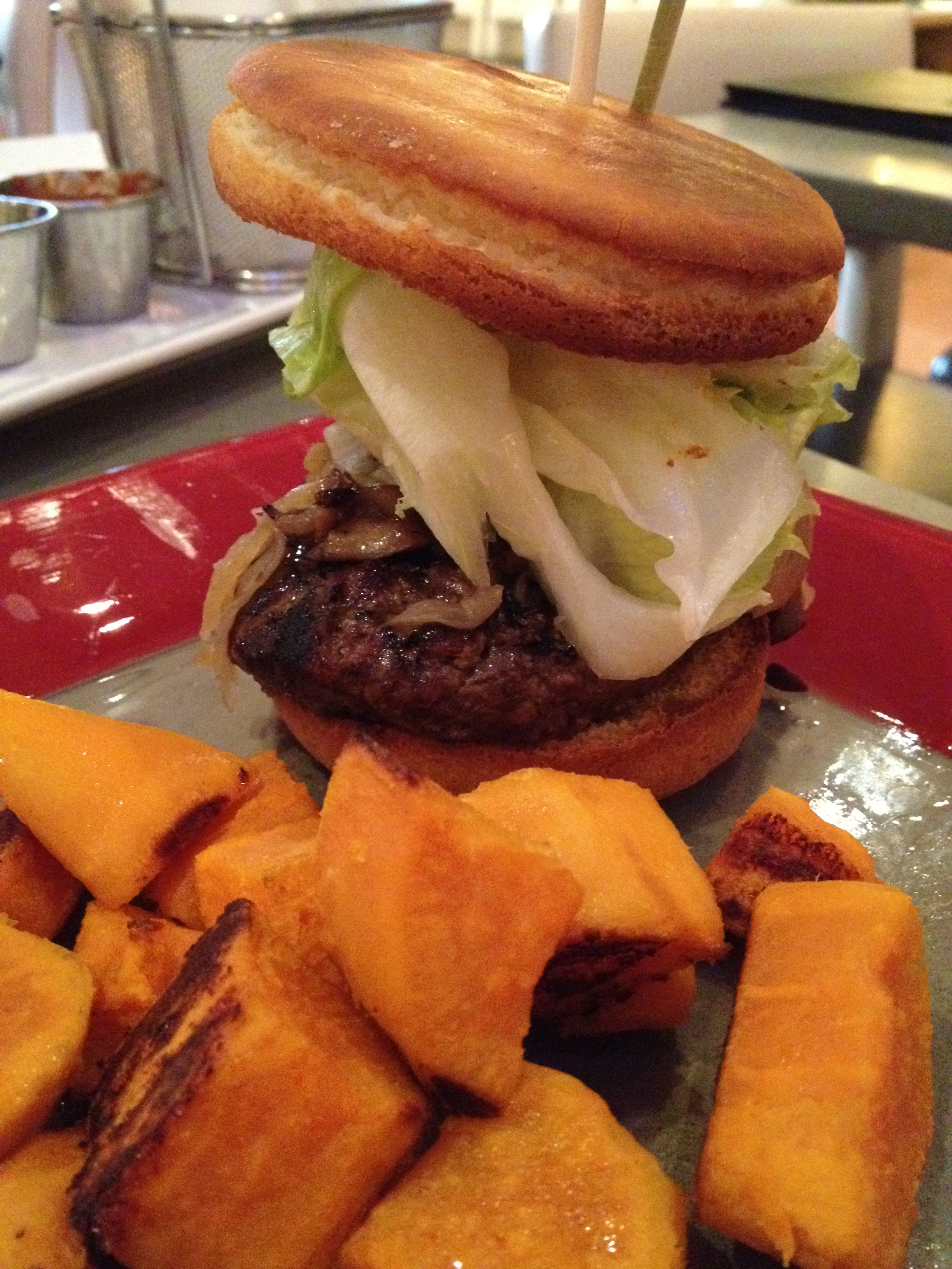 A very tall mushroom and onion burger on a gluten free bun. With gluten free sweet potato fries.