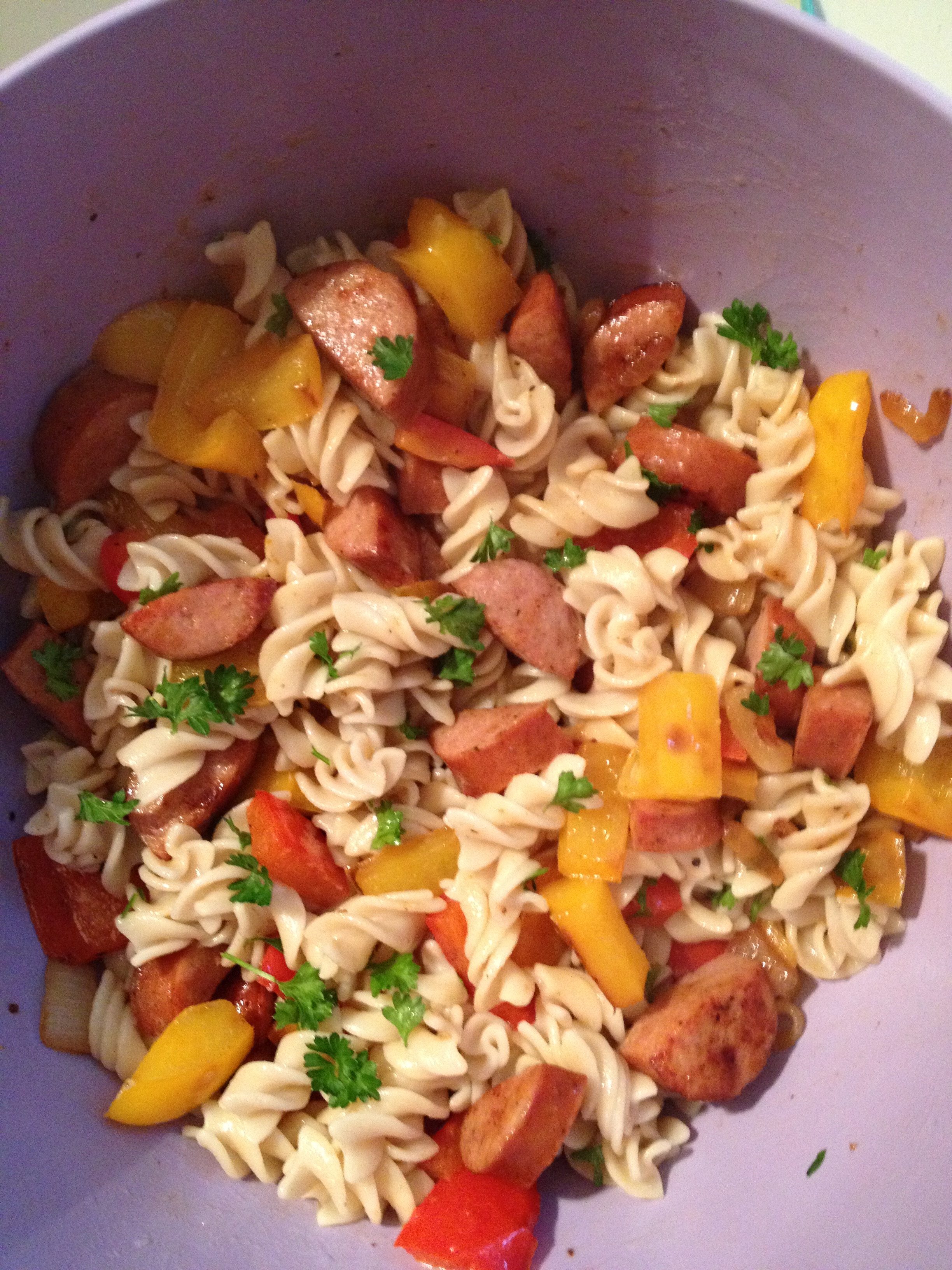 Part of my cultural background is Polish, and I love it when my mother cooks Kielbasa sausage on a weekend morning.  So why not have it for lunch or dinner, too?  This is a spicy pasta salad that combines the classic summer flavors of sausage, peppers, and onion.  Hope you enjoy, as I have been this week!
