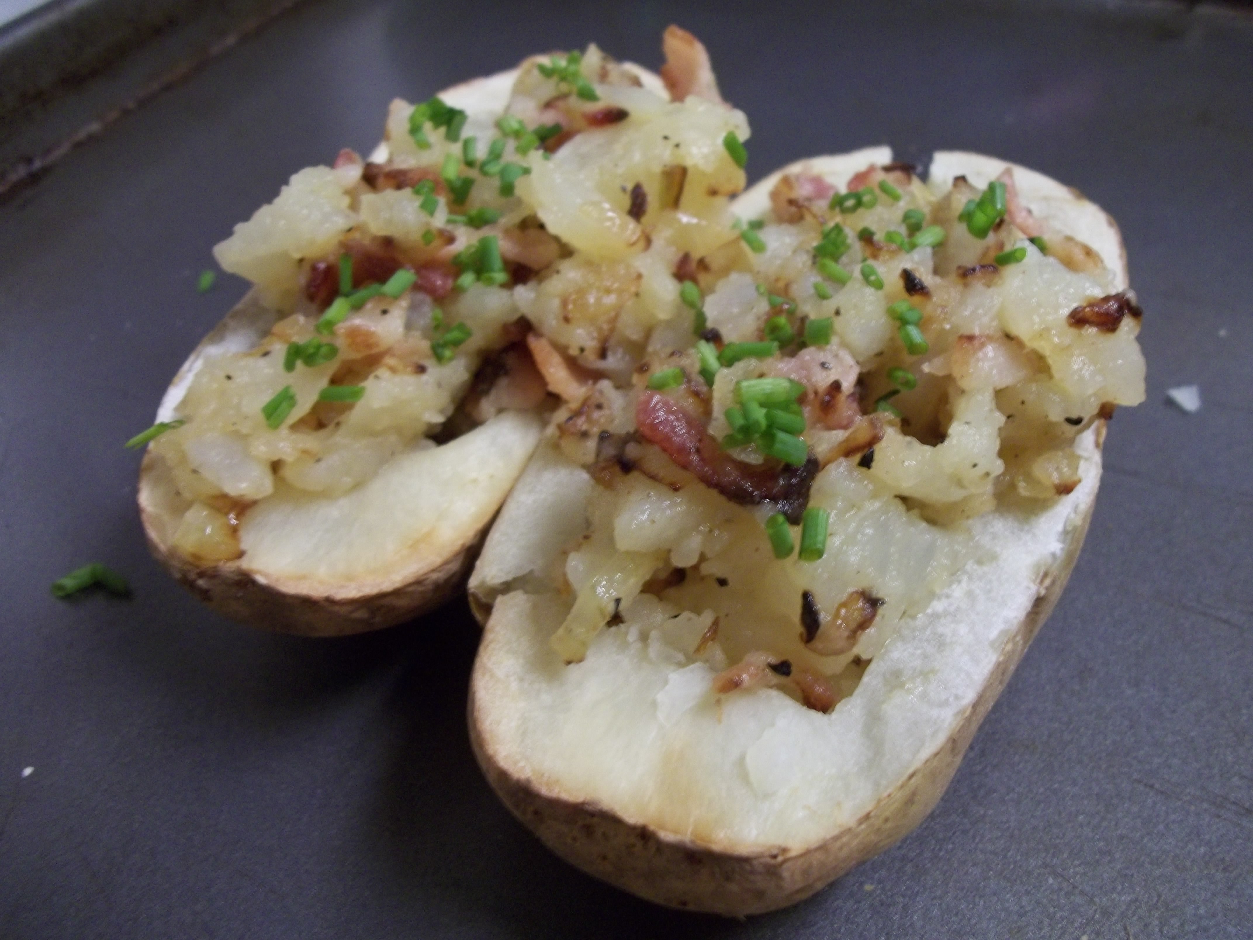 - Scoop the bacon, onion, and potato mixture back into the hollowed out potatoes.