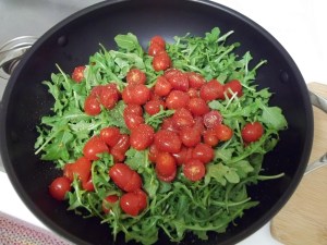 - In a large skillet (or my favorite Giada pan), put 1 bag of arugula, chopped tomatoes, and olive oil.