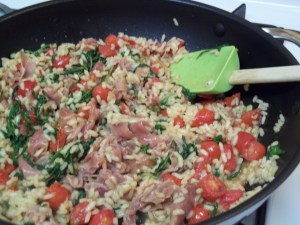 - Put cooked risotto into the skillet to combine with tomatoes and arugula.