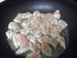 I took a package of chicken breast tenderloins and cut them into bite sized chunks. In a large saute pan, pour enough olive oil to lightly coat the pan. Add the chicken, as well as 3 tbsp. white wine vinegar, some lemon juice, and salt and pepper. I tried out some new seasonings… smoked salt and lemon pepper… yum! Cook the chicken on medium heat, covered, about 7 minutes until they are cooked through. If you are really into summer living, you could also marinate the chicken tenderloins in lemon juice, white wine vinegar, salt and pepper, and then grill them.