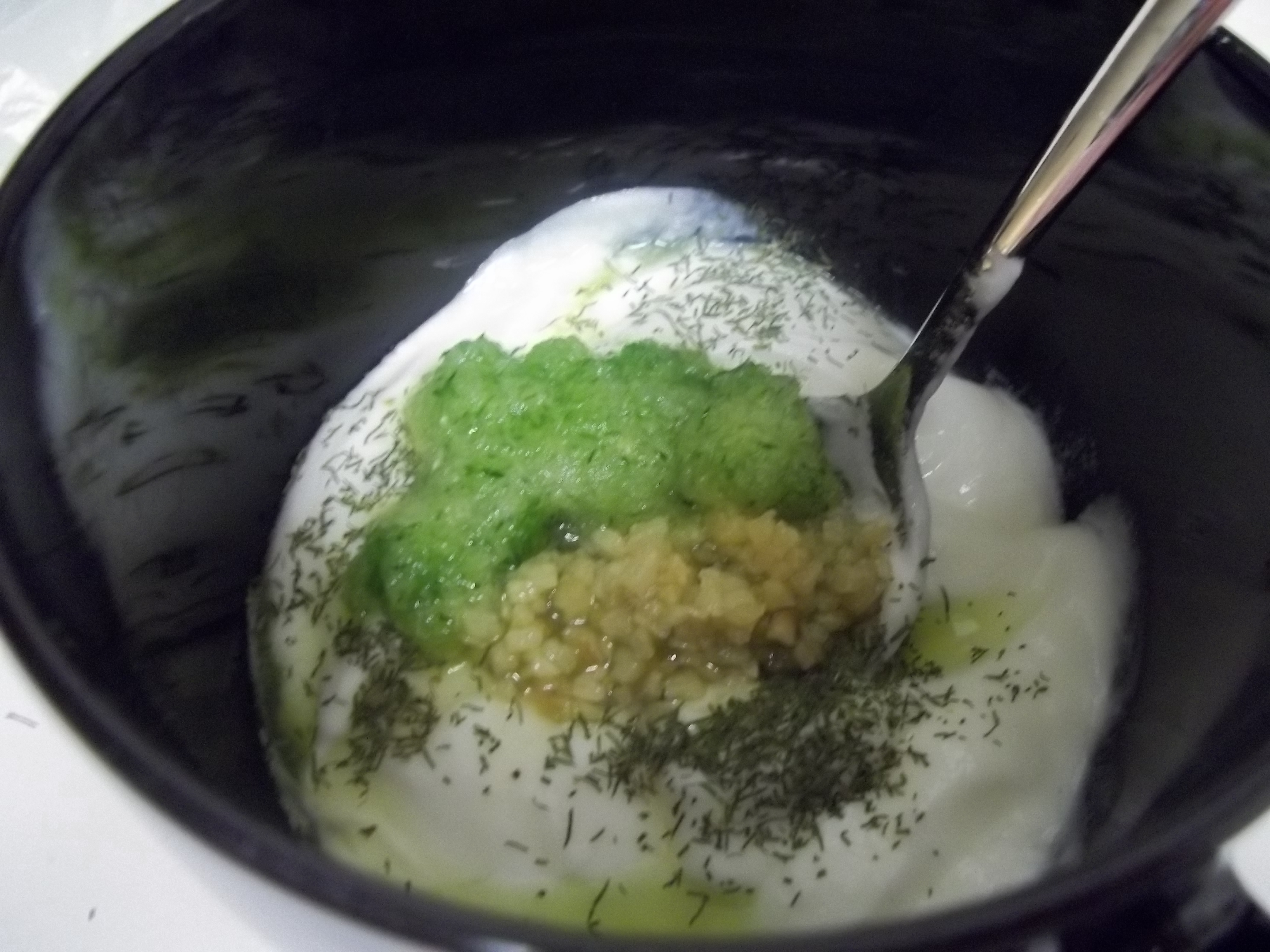 For the sauce, I emptied one container of dairy free plain yogurt into a bowl. Then I added 3 tsp. chopped garlic, a few generous shakes of dill and parsley, one eighth of a cup of white wine vinegar, the juice of one lemon, some sea salt, and grated cucumber. To grate the cucumber, I use a microplane or zester. Cut off the end of the cucumber and push the flat end back and forth across the grater, over the bowl. Grate until you have about 3 tsp of cucumber goodness. Mix all together, pour over the chicken, and serve!