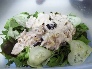 I cut a few slices of home roasted chicken and pulled apart the pieces with two forks. I then added a tablespoon of lemonaise, as well as some craisins and walnut pieces. A perfect salad topper!