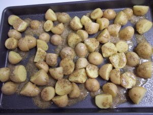 Slice a bag of your favorite baby gold or red potatoes in half.