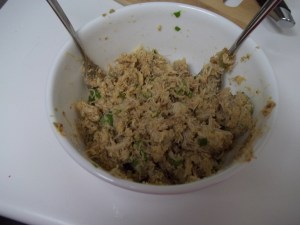 To the crab, add one fourth plus one eighth cup gluten free bread crumbs, 2 tbsp of your favorite Honey Dijon mustard, 2 tbsp mayo or veganaise, 2 tsp Worcestershire sauce, 2 tsp rosemary, 2 tbsp chopped scallions, 1 tbsp ground flaxseed (optional, but I like the added health benefits). Combine all ingredients by mixing together with two forks.