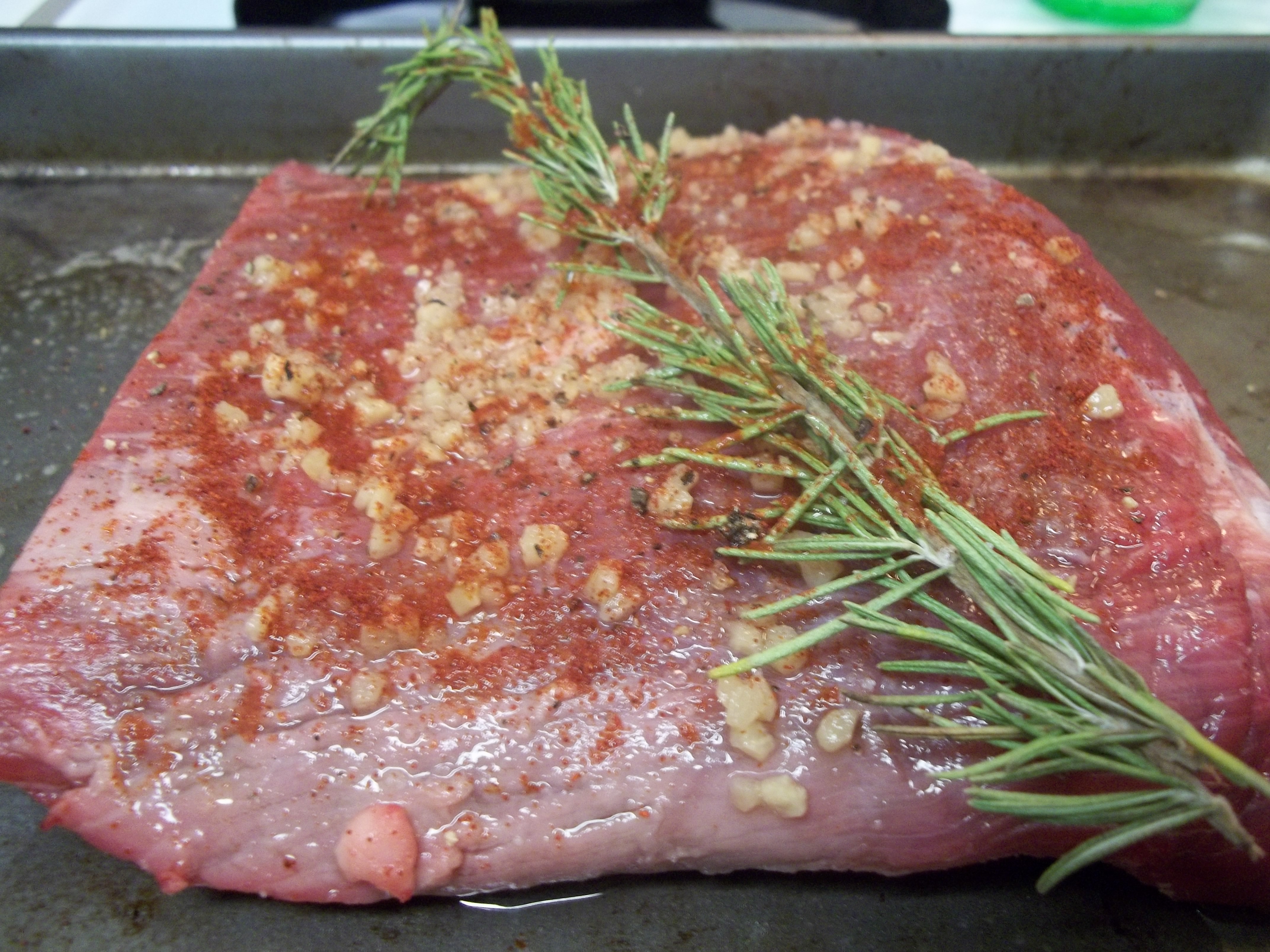 To cook the flank steak, I marinated it in some red wine, red wine vinegar, chopped garlic, rosemary, salt and pepper. A good marinade always has an acid (vinegar) to tenderize the meat, and some strong spices that will infuse into the meat. I then cooked the steak in the oven at 375 for about 8-10 minutes, for a rare taste.