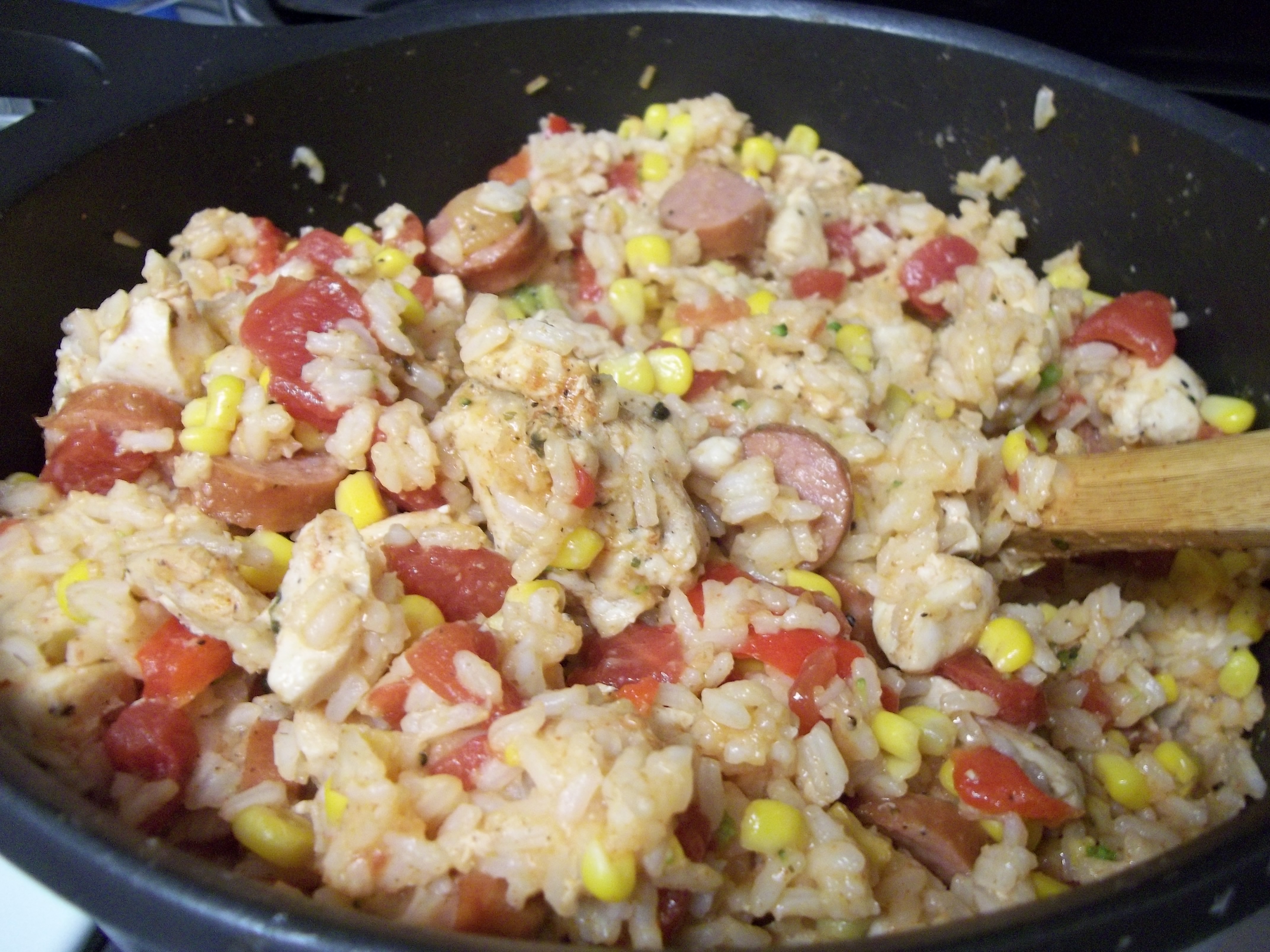 - In a large pan, add the rice, chicken, canned chopped tomatoes, sausage links (cut into bite size pieces), package of corn and pepper mix, 1 tbsp. Slap Ya Mama seasoning, 1 tsp. cumin, 1 tsp. smoked paprika.