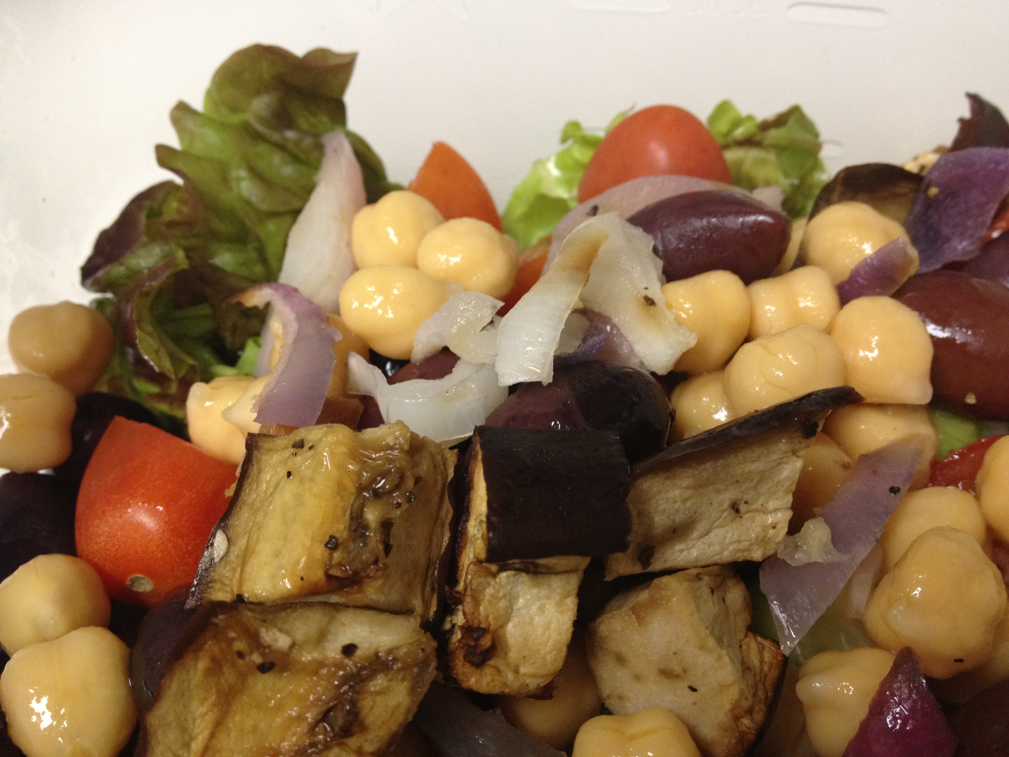 - Over a bed of red leaf lettuce, toss grape tomatoes, cucumbers, chick peas, olives, eggplant, and red onion. (If you are a dairy person, you could add feta cheese.)