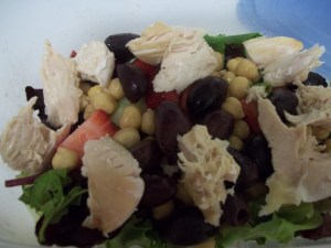 For the dressing, combine 3 parts red wine vinegar to 1 part olive oil, chopped garlic, oregano (and any other of your favorite herbs), the juice of one half of a lemon, salt, and pepper.