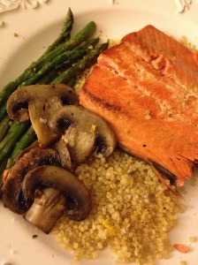 - Serve the quinoa on a plate, topping with the asparagus, mushrooms, and salmon on top.