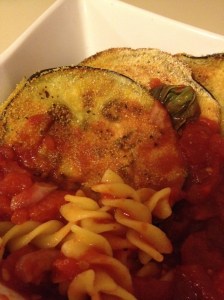 I cooked the corn pasta, made a quick tomato sauce, and sliced the eggplant to make crispy eggplant (oh, how I love this recipe!). I served the pasta and sauce over the crispy eggplant for a perfect week night meal!