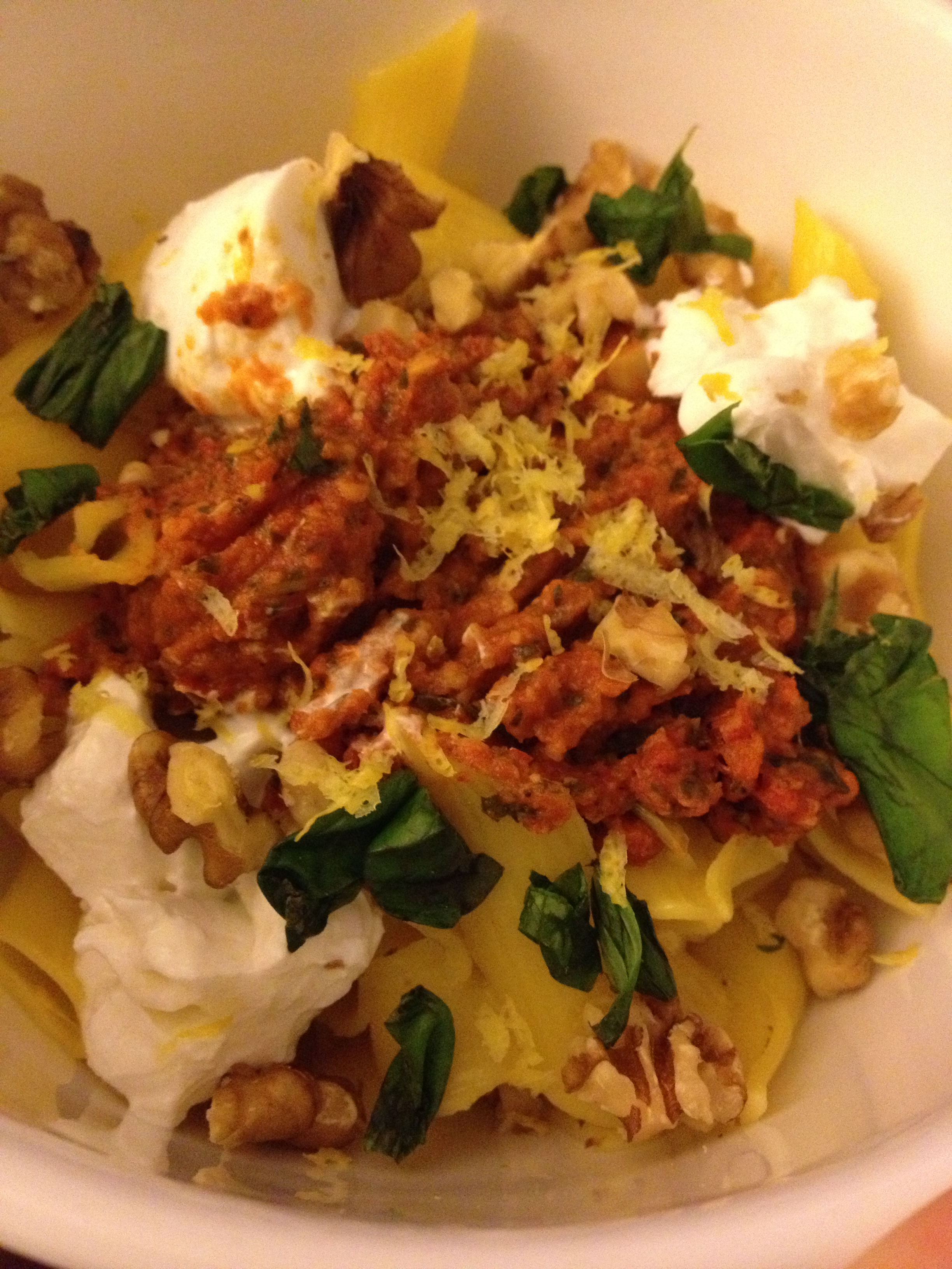 I then put the roasting pan in the oven at 375 for about 20 minutes until heated through. This recipe is similar to Mama’s Meat Sauce, and almost as tasty! You could certainly use Mama’s Meat Sauce over the corn pasta and eggplant for a heartier meal.