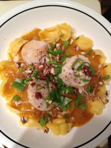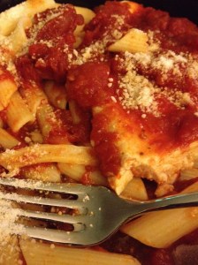 I had one of those crazy-get-home-late-and-don’t-know-what-to-make-for-dinner nights. So, I looked in the cabinets and settled on just plain gluten free pasta with tomato sauce. But then I looked a little deeper into the cabinets and decided to jazz it up a bit with some canned white beans, frozen spinach, and onion I had lying around. It turned out wonderfully delicious!