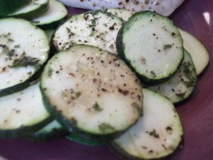 - Using an olive oil mister, spray the potato slices lightly with oil so they will crisp.
