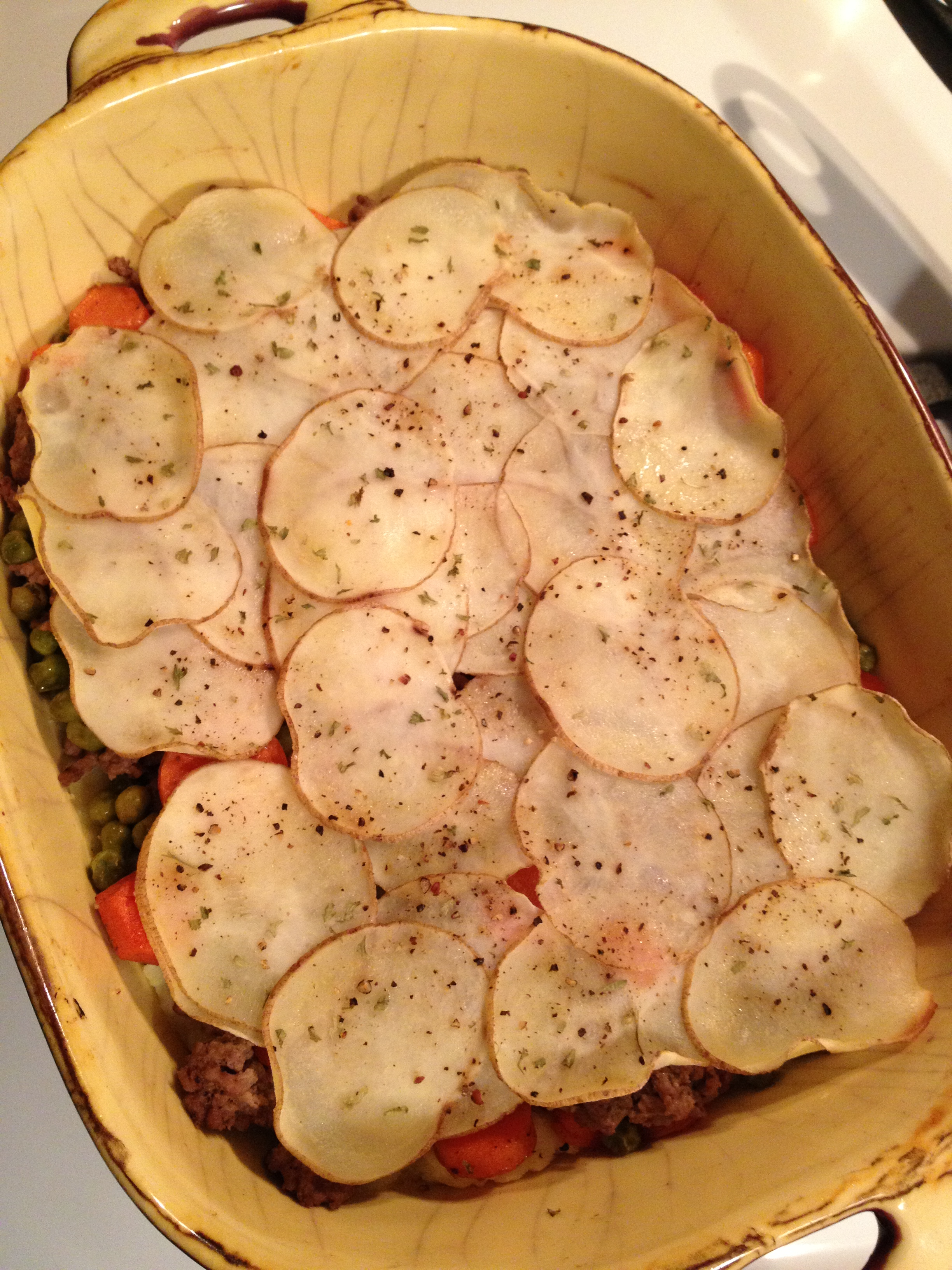 - On top of the beef mixture, use a mandolin to shave potato slices from the extra russet potato. Cover the beef mixture evenly with potato slices.