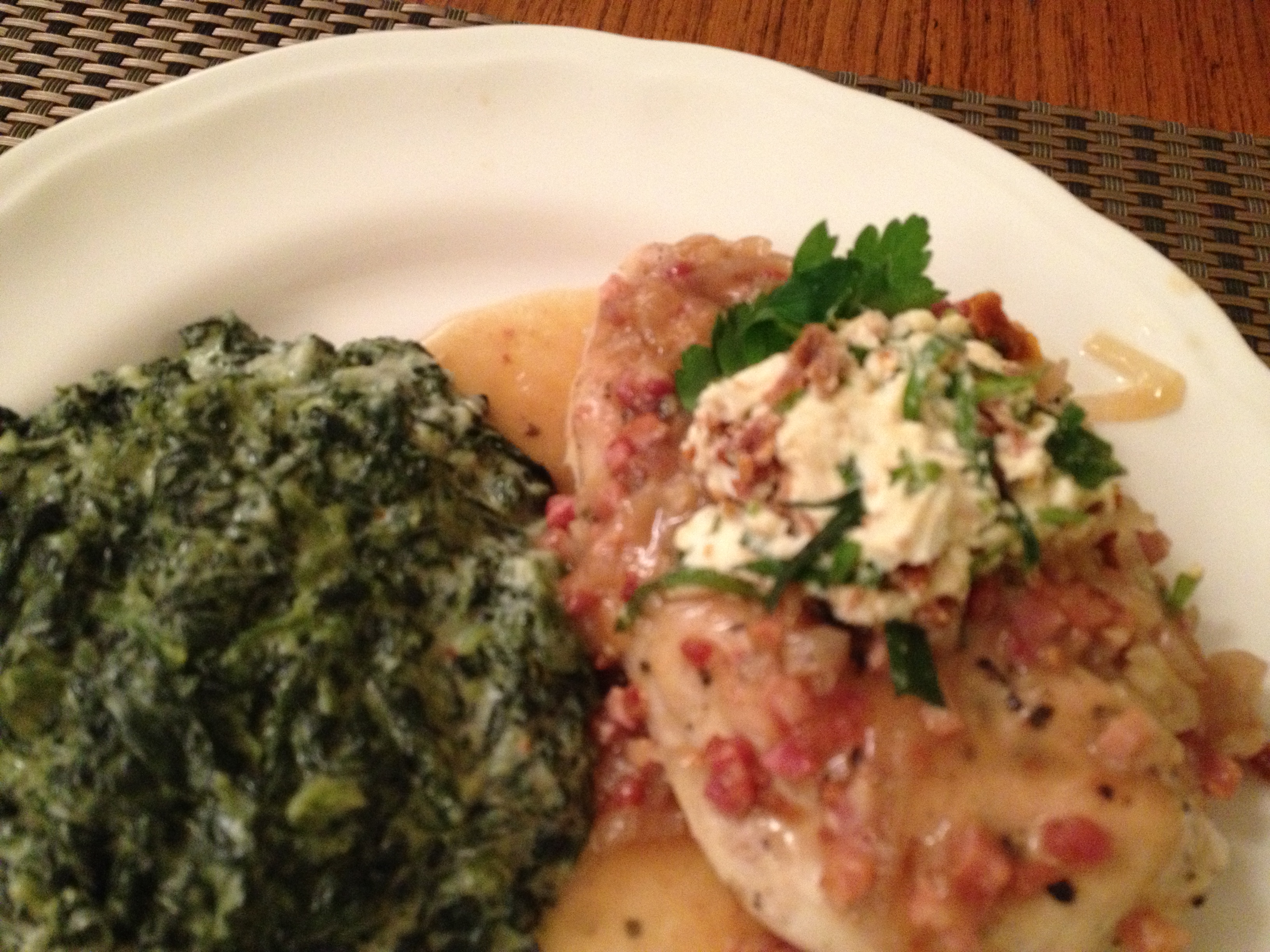 - Plate chicken with shallots, pancetta and pan sauce. Top with goat cheese mixture before serving.