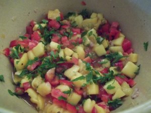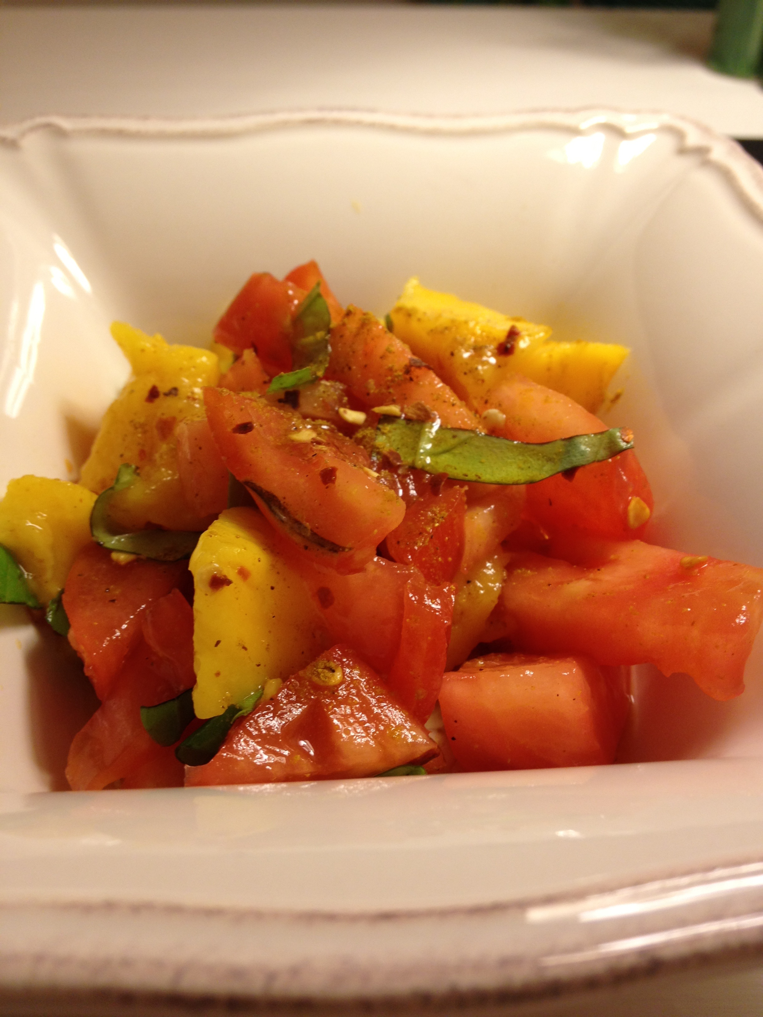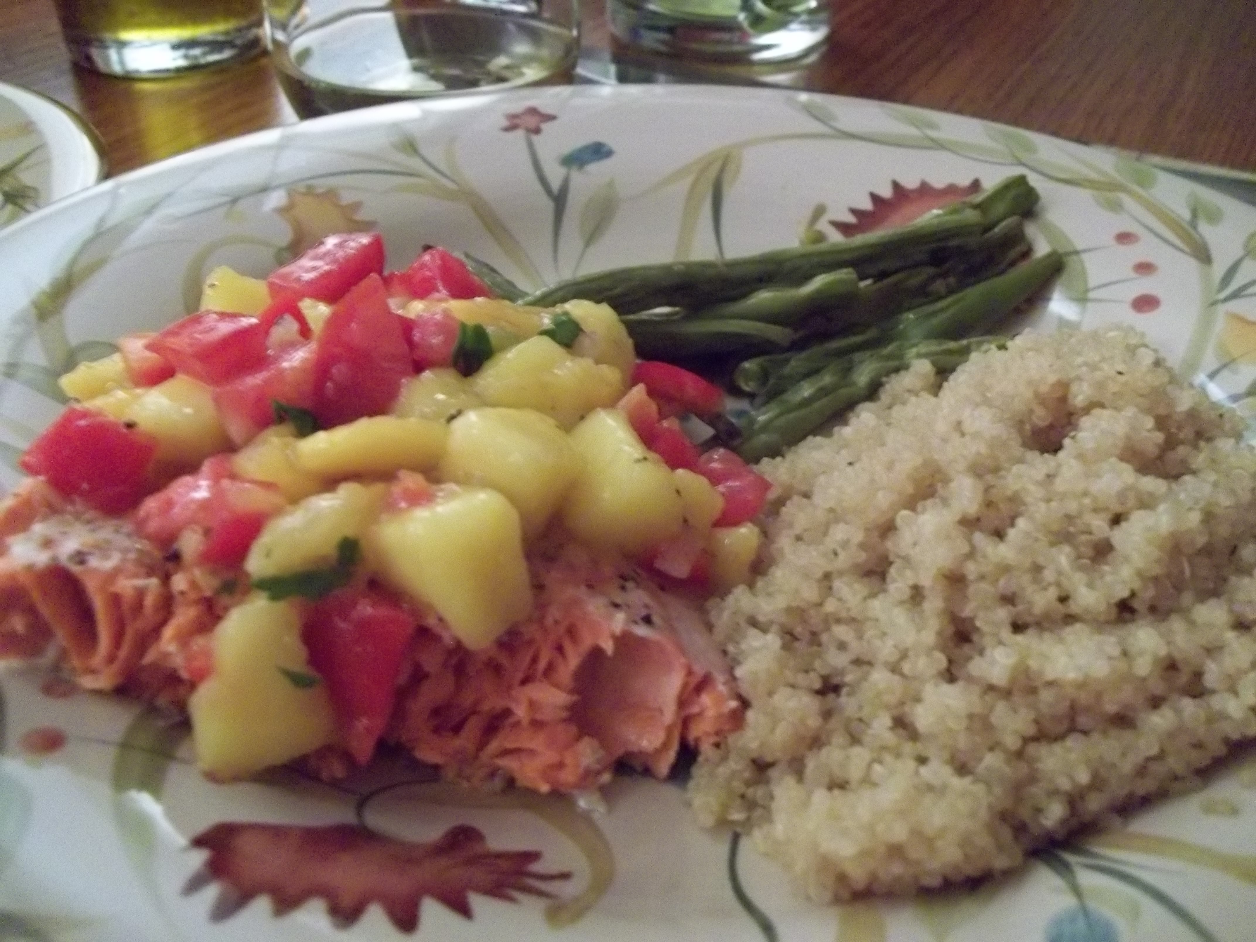This week, my mom made salmon with summer salsa on top, with roasted green beans and quinoa on the side.  We went to the local farmer’s market to get fresh fruits and veggies for the salsa…always the best way to get fresh and less expensive produce.  The salsa included chopped mango, red pepper, tomato, jalapenos, shallots, a tablespoon of apricot jam, olive oil, balsamic vinegar, and lime juice.  A perfect summer topping.