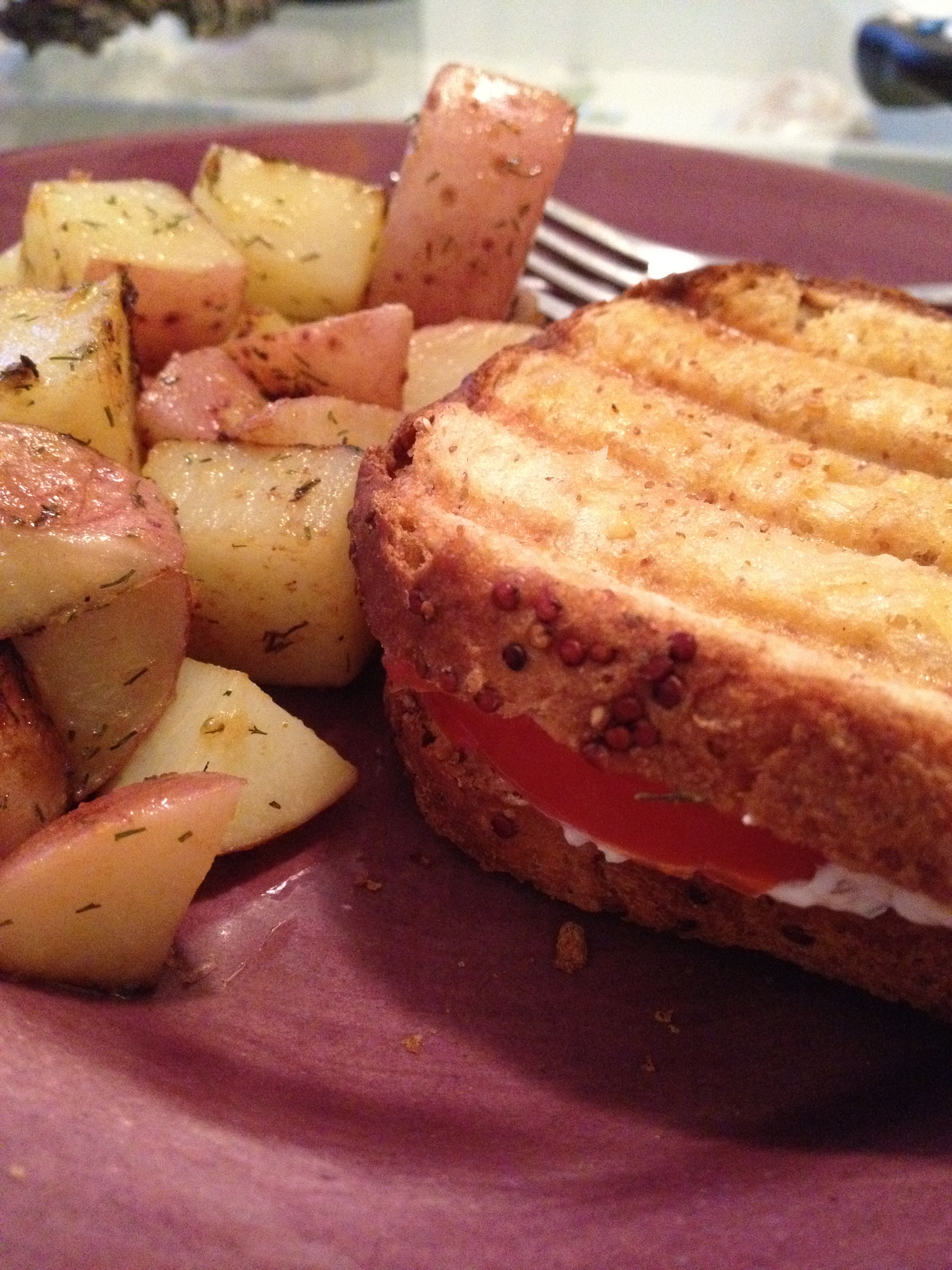 Hello again!  Well, I am in my new house, which is very exciting… but more importantly, the kitchen is just about done!  It was one of my priorities, and I couldn’t get wait to get back in there.  My new kitchen has much more room than my old one, and I am already off and using it.  In these hot summer days, I wanted to be in the kitchen but not create a lot of heat.  So, I made a Tomato, Dill, and Goat Cheese Panini.  Delicious, and the closest thing to a grilled cheese I have had in a while!