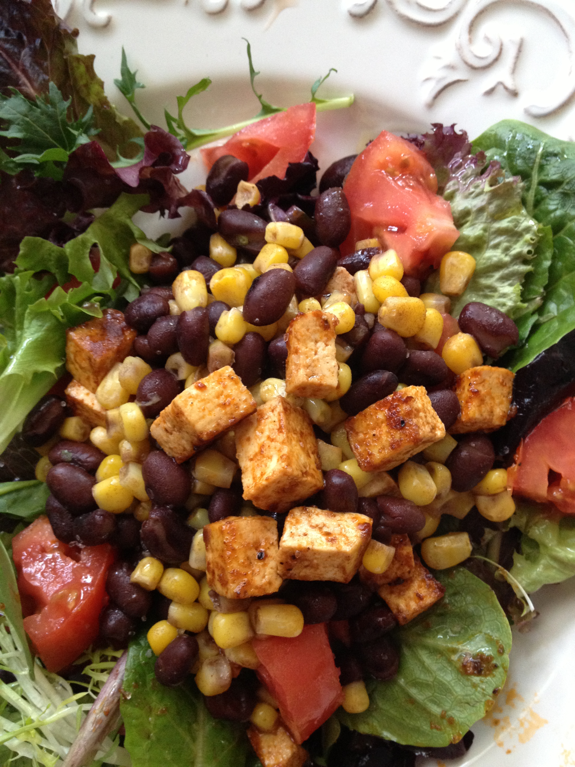 4. To make each salad, make a large bed of lettuce.  Top with corn and bean mixture, BBQ tofu, sliced tomato, and sliced avocado (if you wish).  Dress with extra 1 tbsp. of BBQ sauce and extra 2 tsp. lime juice.